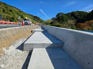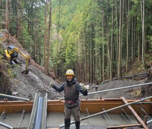 大雨で崩落した道路の復旧工事になります。今年は大雨の日が多く工事中雨により、資材や機材が濁流に流されてしまう事があったりと、なかなか大変な現場でした。約2カ月の工事でしたがもうすぐ完工します。