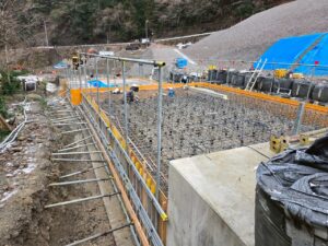 水門工事になります。付随工事として階段、袖壁も施工しました。 この後、水門機械本体が取り付けられるため、基礎、柱部分などコンクリートの製品精度は高いものが求められます。